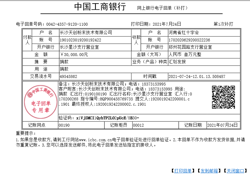 看到這種情況,各地企業與個人都向河南伸出援助之手長沙天創粉末技術有限公司也向河南捐款3萬元。